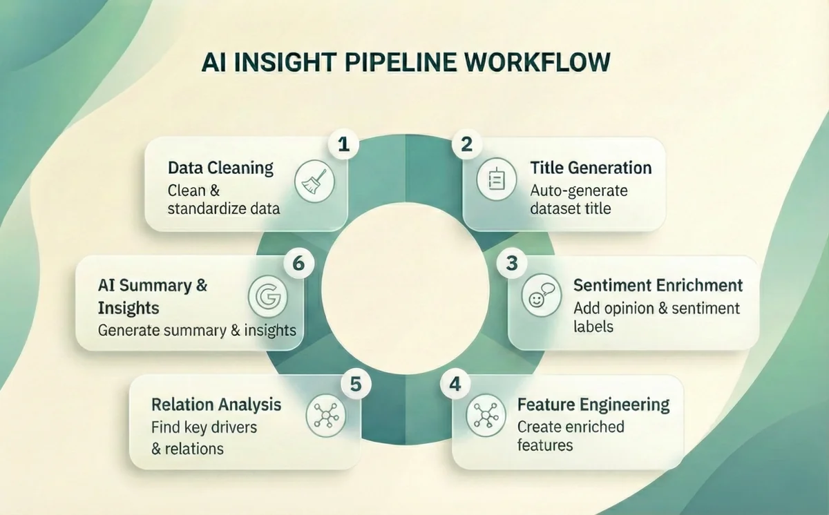 End-to-end automated data intelligence pipeline performing profiling, cleaning, sentiment analysis, feature engineering, relation discovery, and report generation.