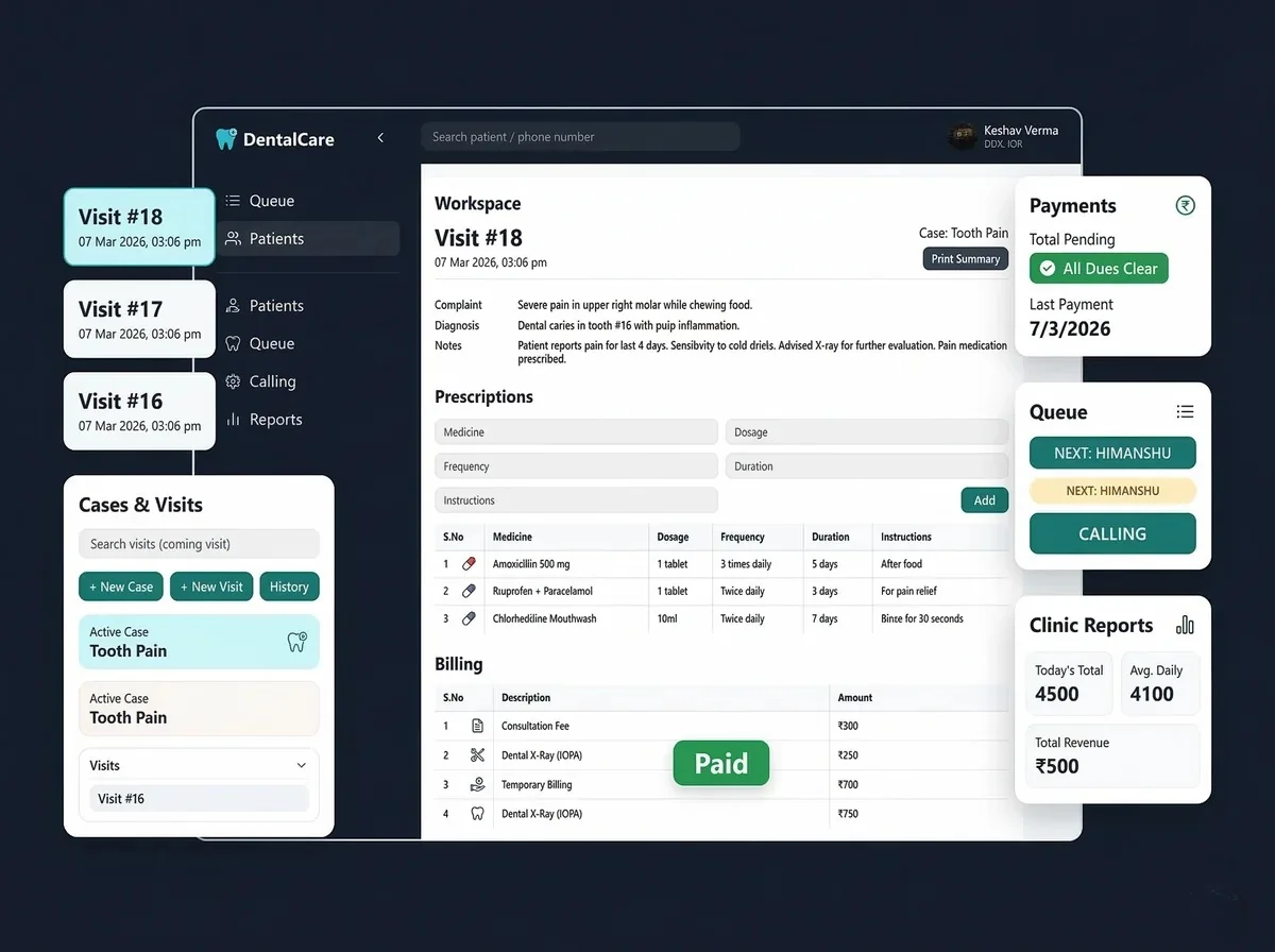 Full-stack healthcare workflow platform for managing patients, visits, prescriptions, billing, and queue management with role-based access.