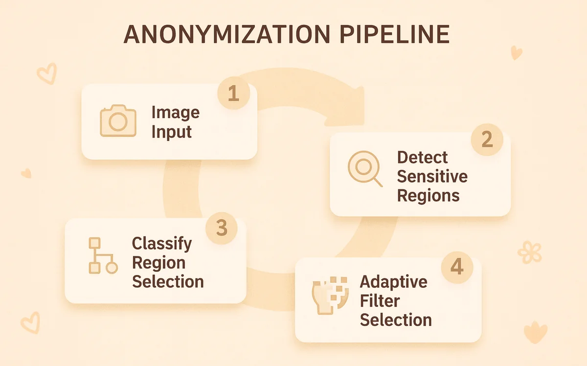 AI system that detects sensitive regions like faces, text blocks, ID cards and license plates, applying adaptive anonymization filters.