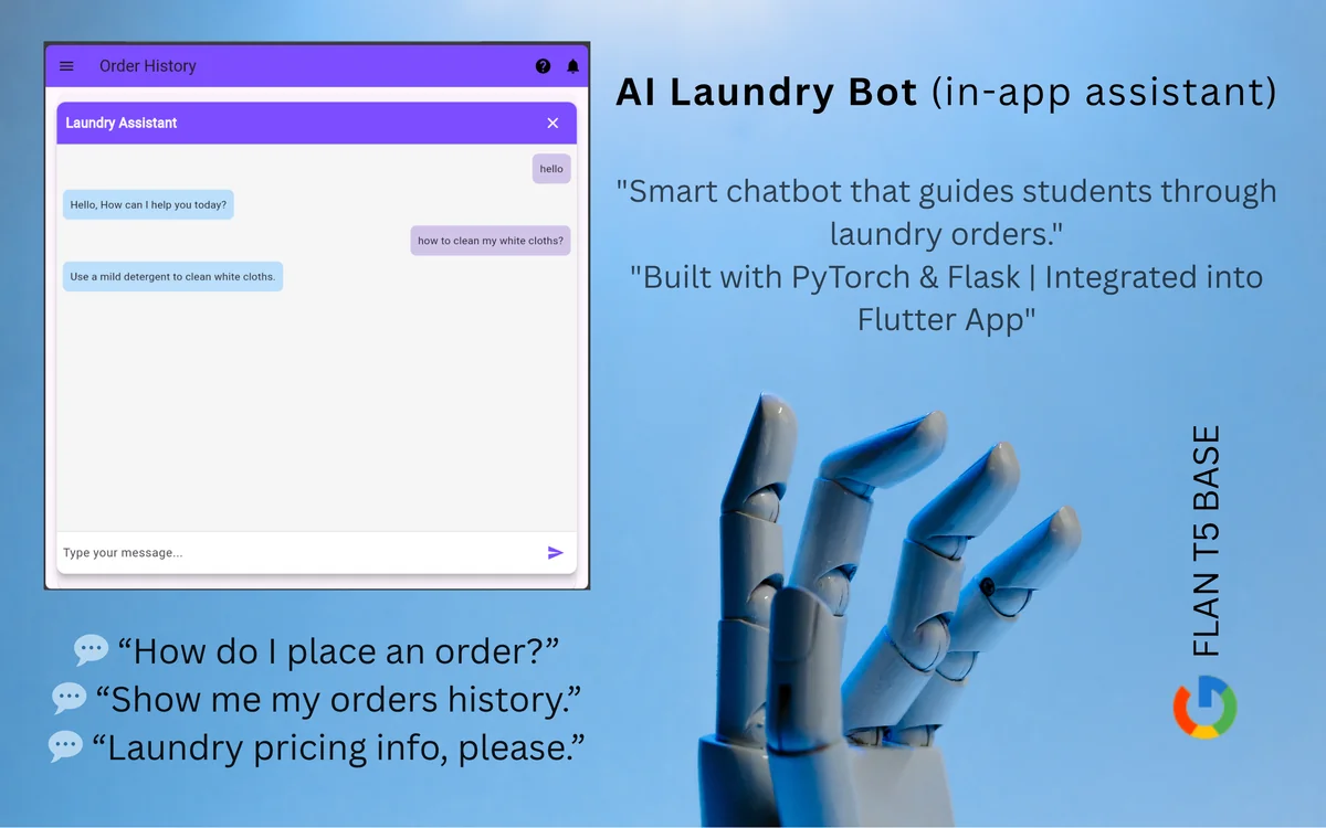 AI chatbot integrated into the Laundry App using FLAN-T5, Flask, and HuggingFace to assist users with laundry queries.