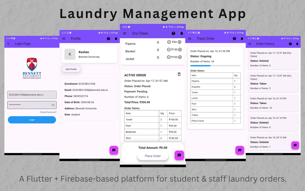 Flutter-based university laundry management platform with real-time order tracking and staff-side controls using Firebase.